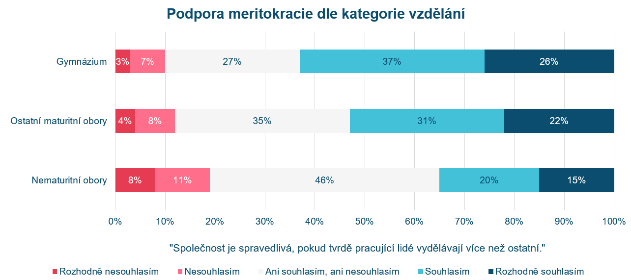 V první vlně CZEPS jsme zkoumali také postoje žáků a žákyň k principům distribuční spravedlnosti. Ptali jsme se jich, kdy je rozdělení zdrojů (např. příjmů nebo bohatství) ve společnosti spravedlivé. Graf zobrazuje souvislost mezi kategorií vzdělání a souhlasem s výrokem, že „Společnost je spravedlivá, pokud tvrdě pracující lidé vydělávají více než ostatní.“. Jinými slovy, tento graf analyzuje, jak souvisí kategorie studovaného oboru a postoj k meritokracii. Odpovědi 22,782 žáků a žákyň ukazují, že meritokracie má nejvyšší podporu u žáků a žákyň gymnaziálních oborů. Konkrétně souhlas s výrokem vyjádřilo celkem 63 % gymnazistů a gymnazistek. Naopak nejnižší podporu má meritokracie mezi žáky a žákyněmi nematuritních oborů, kde s výrokem souhlasila jenom přibližně třetina dotazovaných (35 %). Až téměř polovina žáků a žákyň nematuritních oborů nevyjádřila žádný názor (odpověď ani souhlasím, ani nesouhlasím). Celkově se tedy zdá, že gymnaziální obory přitahují spíše meritokraticky založené žáky a žákyně. V dalších vlnách CZEPS bude zajímavé sledovat, jestli podpora meritokracie u gymnazistů a gymnazistek narůstá v čase.