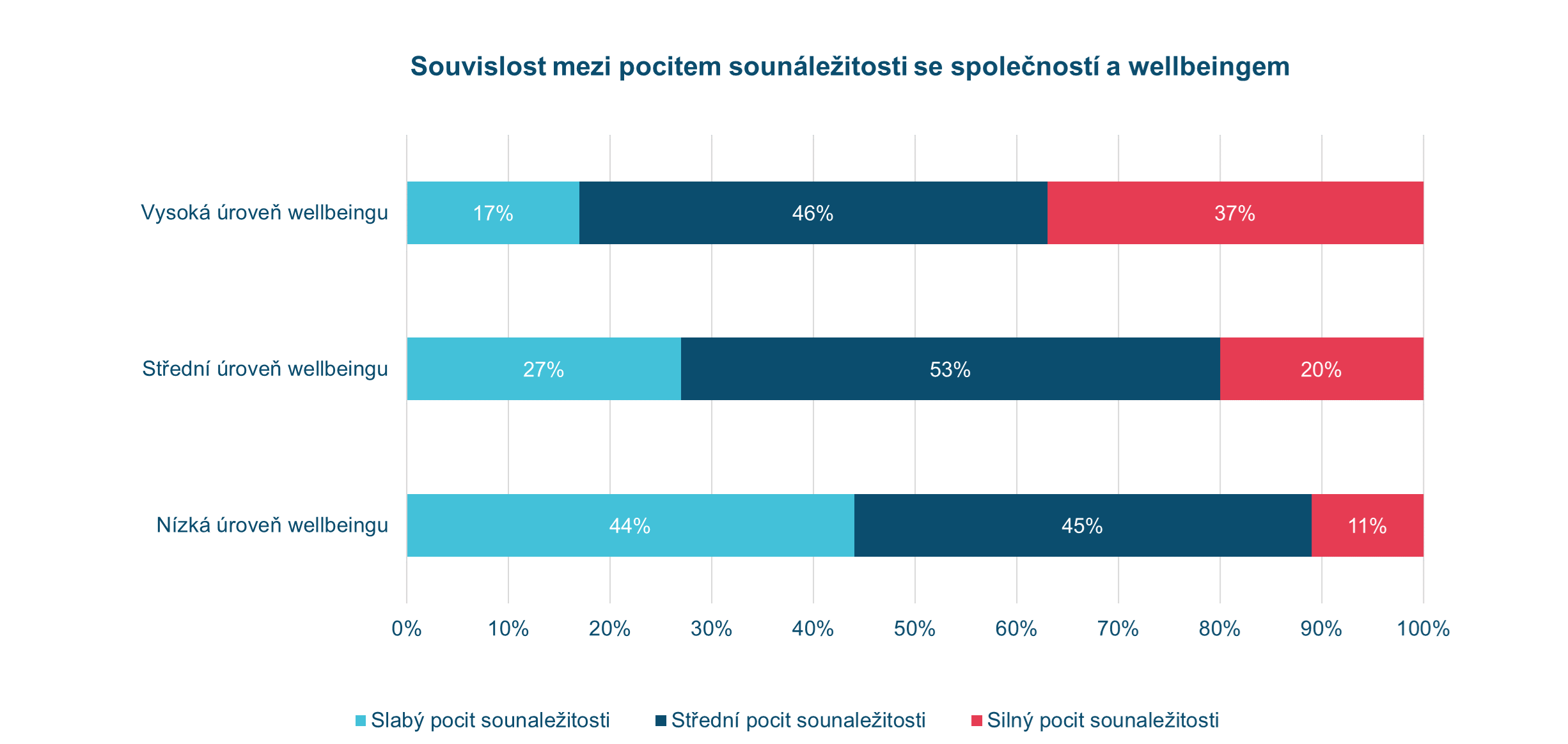 V první vlně sběru dat CZEPS jsme respondenty dotazovali i na pocit sounáležitosti se společností. Jedná se o koncept, který měří, nakolik se dotazovaný jednotlivec cítí být přijat a respektován společností ve které žije. Zkoumali jsme, zda pocit sounáležitosti se společností souvisí s wellbeingem. Pro usnadnění interpretace byly hodnoty pocitu sounáležitosti transformovány do 3 kategorií na slabý, středný a silný. Stejný postup byl uplatněn na hodnoty wellbeingu (nízká, střední a vysoká úroveň). Výsledky obsahující 22 564 odpovědí žáků a žákyň ukazují, že vyšší úroveň wellbeingu souvisí se silnějším pocitem sounáležitosti se společností. Graf ukazuje, že jen 17 % adolescentů s vysokou úrovní wellbeingu pociťuje slabý pocit sounáležitosti se společností. Naopak slabý pocit sounáležitosti pociťuje 44 % žáků a žákyň s nízkou úrovní wellbeingu. Silný pocit sounáležitosti vyjádřilo jen 11 % adolescentů s nízkou úrovní wellbeingu, ale až 37 % adolescentů s vysokou úrovní wellbeingu. Výsledky naznačují, že pro celkové psychické zdraví a duševní pohodu adolescentů je důležité, aby se cítili plnohodnotnými členy společnosti.