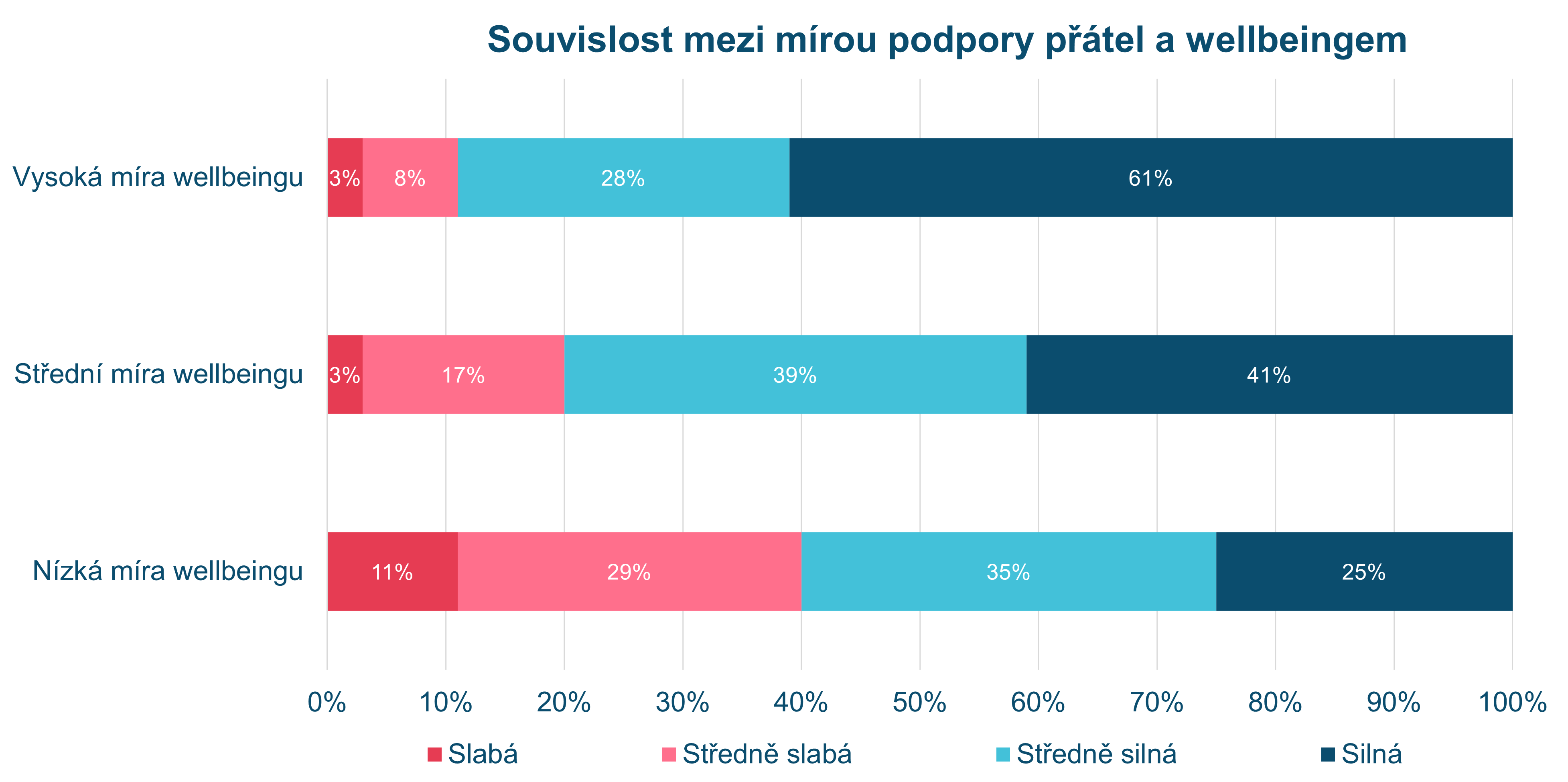 Podporující prostředí je jedním z faktorů souvisejících s tím, jak se jedinec ve svém životě cítí a funguje. Zejména v adolescenci je podpora přátel a vrstevníků klíčová, neboť podporující přátelství poskytují mladým lidem pocit přijetí, sounáležitosti a obecně přispívají k lepší duševní pohodě. Zajímalo nás, zda je tato souvislost přítomna i u žáků a žákyň druhých ročníků středních škol účastnících se druhé vlny výzkumu CZEPS. Graf níže obsahuje odpovědi 20 404 žáků a žákyň a ukazuje, že více než tři pětiny (61 %) žáků a žákyň s vysokou mírou wellbeingu pociťují silnou podporu od svých přátel, zatímco v případě žáků a žákyň se střední mírou wellbeingu je to o 20 p. b. méně (tj. 41 %). V případě žáků a žákyň s nízkou míru wellbeingu pociťuje silnou podporu od svých přátel již pouze čtvrtina (25 %) z nich. Naopak, slabou míru přátelské podpory pociťuje více než desetina (11 %) žáků a žákyň s nízkou mírou wellbeingu a pouze 3 % žáků a žákyň se střední či vysokou mírou wellbeingu. Z grafu lze dále vyčíst, že čtyři z deseti dotázaných adolescentů s nízkou mírou wellbeingu pociťují „slabou“ či „středně slabou“ míru podpory od svých přátel, zatímco v případě žáků/žákyň s vysokým wellbeingem je to pouze 11 %. Na základě těchto výsledků lze konstatovat, že úroveň wellbeingu a míra podpory přátel spolu pozitivně souvisí. Otázka, zda míra podpory přátel ovlivňuje míru wellbeingu nebo je tomu naopak bude předmětem dalších analýz.