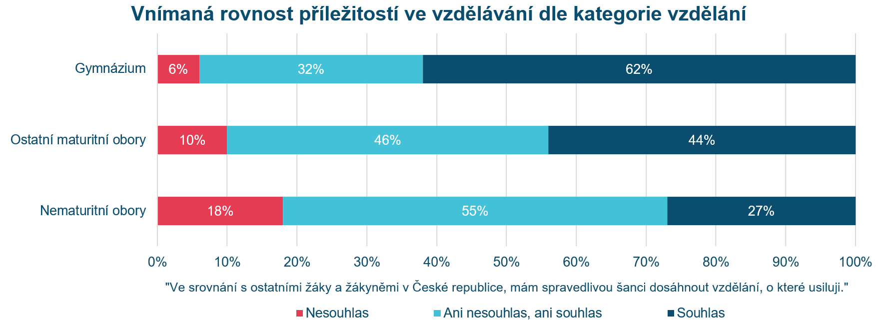 Výsledky druhé vlny šetření CZEPS ukazují, že subjektivní pocit spravedlivé šance dosáhnout požadovaného vzdělání se mezi žáky a žákyněmi různých kategorií vzdělání výrazně liší. Souhlas s uvedeným výrokem vyjádřilo 62 % žáků a žákyň gymnázií, zatímco u ostatních maturitních oborů to bylo 44 % a u nematuritních oborů pouze 27 %. Naopak nesouhlas s výrokem častěji uváděli žáci a žákyně nematuritních oborů (18 %) než žáci a žákyně gymnázií (6 %). Zároveň žáci a žákyně nematuritních oborů mnohem častěji volí střední kategorii hodnocení subjektivní rovnosti příležitostí než gymnazisté, což může naznačovat nižší míru vyhraněnosti jejich postojů v této oblasti. V grafu prezentované rozdíly obecně naznačují, že kategorie vzdělání může ovlivňovat vnímání rovnosti příležitostí ve vzdělávání. Detailnější navazující analýzy pak mohou odhalit strukturální či institucionální faktory, které ovlivňují subjektivní vnímání této spravedlnosti, a tím přispět k lepšímu porozumění vzdělanostních nerovností.